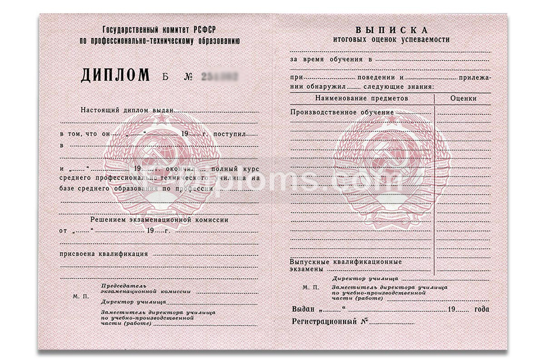 У нас на сайте Вы можете купить диплом пту ссср с окончанием любого технического училища в период с 1970-х годов до 1994 года включительно. Вам доступны документы не только РСФСР и других союзных республик (делаем по образцу). Доставка бесплатна, оплата при получении, для проживающих в регионах доступна услуга «макет», есть скидки. При заказе до 14.00 привезем уже завтра!